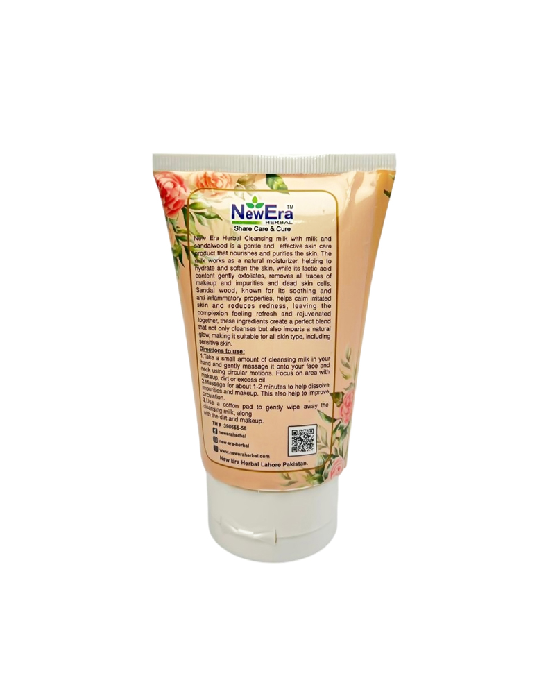 New Era Herbal Cleansing milk with milk and sandalwood is a gentle and effective skin care product that nourishes and purifies the skin. The milk works as a natural moisturizer, helping to hydrate and soften the skin, while its lactic acid content gently exfoliates, removes all traces of makeup and impurities and dead skin cells. Sandal wood, known for its soothing and anti-inflammatory properties, helps calm irritated skin and reduces redness, leaving the complexion feeling refresh and rejuvenated together, these ingredients create a perfect blend that not only cleanses but also imparts a natural glow, making it suitable for all skin type, including sensitive skin.